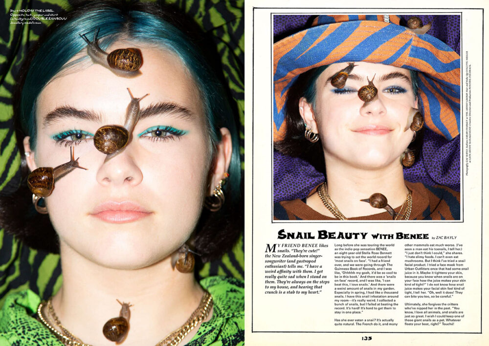 BENEE’S ‘SNAIL BEAUTY’ STORY FOR BUFFALO ZINE CREATIVE PRODUCTION Photography: Zac Bayly Styling: Sarah Starkey Hair + Make-Up: Colette Miller