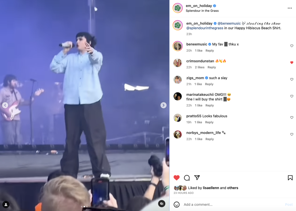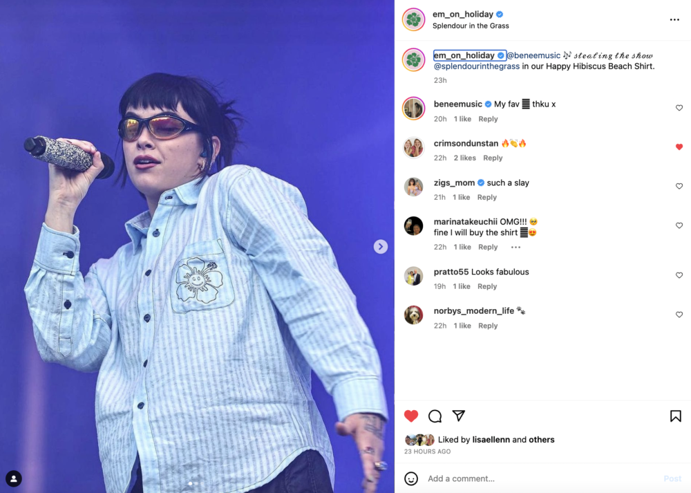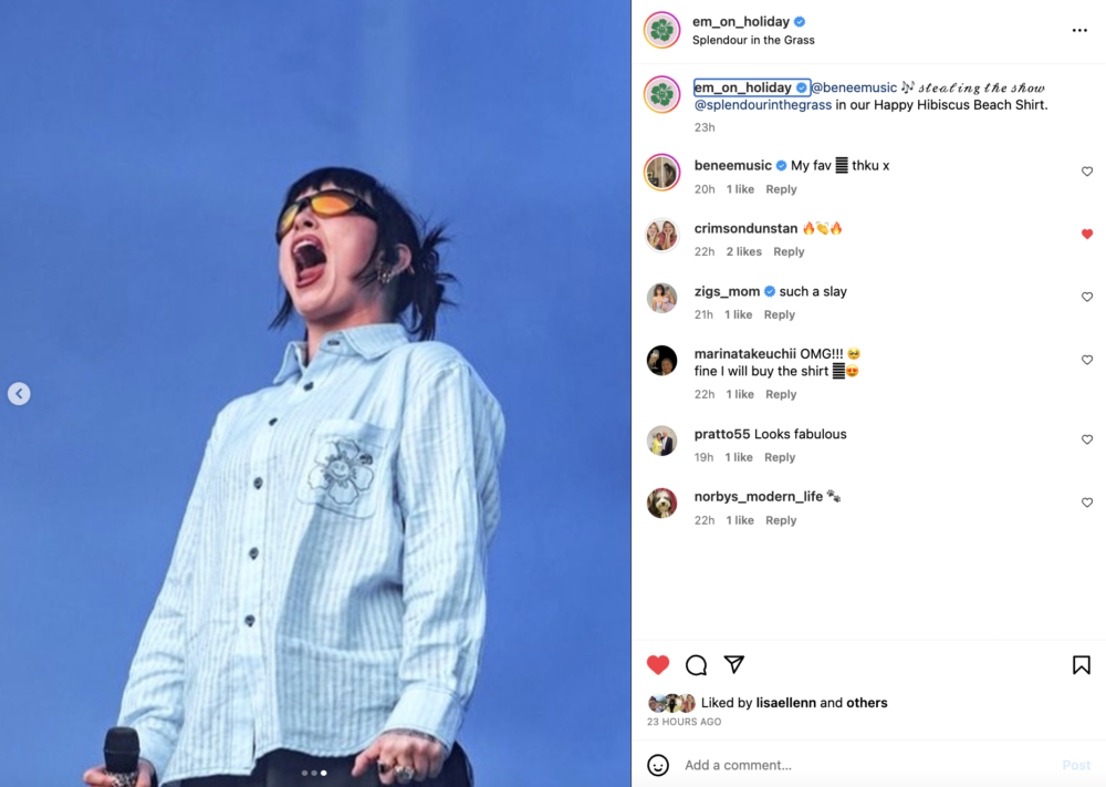 BENEE x Em On Holiday SITG 23 BENEE wearing EM ON HOLIDAY for her debut Splendour In The Grass performance – JULY 2023